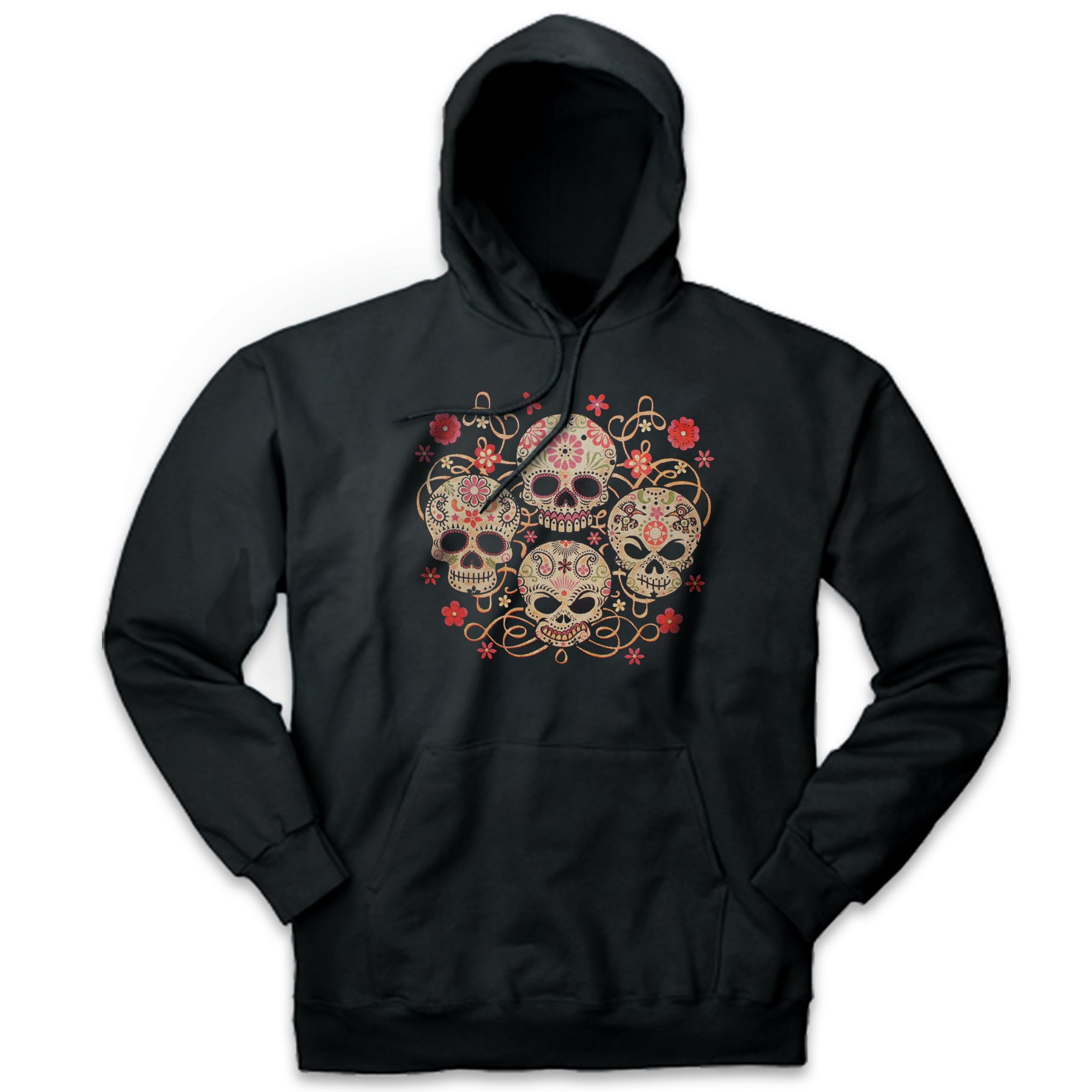 Day of the Dead Hoodie, Colorful Flowered Skulls, Black Unisex Pullover Hoodie Sweater by Casita De Los Muertos