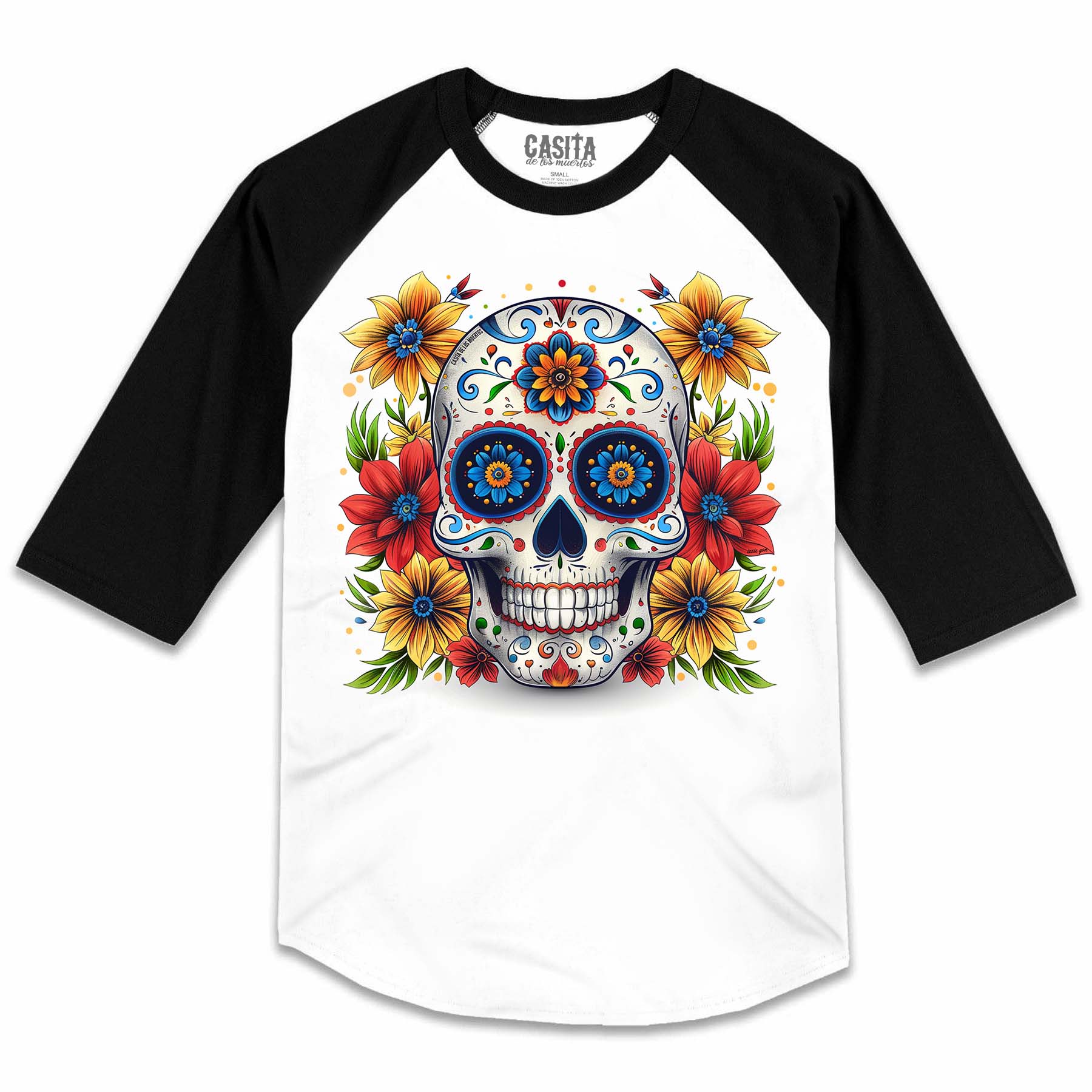 Dia De Los Muertos Colorful Skull Raglan Tee with Calavera by Casita De Los Muertos