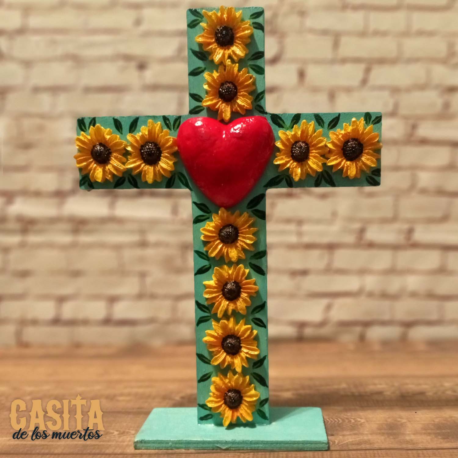 Beautiful Hand Painted Day of the Dead cross with Daisies and Hearts. Our cross is one of a kind, beautifully made to inspire you. A great cross that includes a hanging peg directly on the back for easy display in your home, offices, or special event. All products are carefully packaged to ensure you receive a great product.
