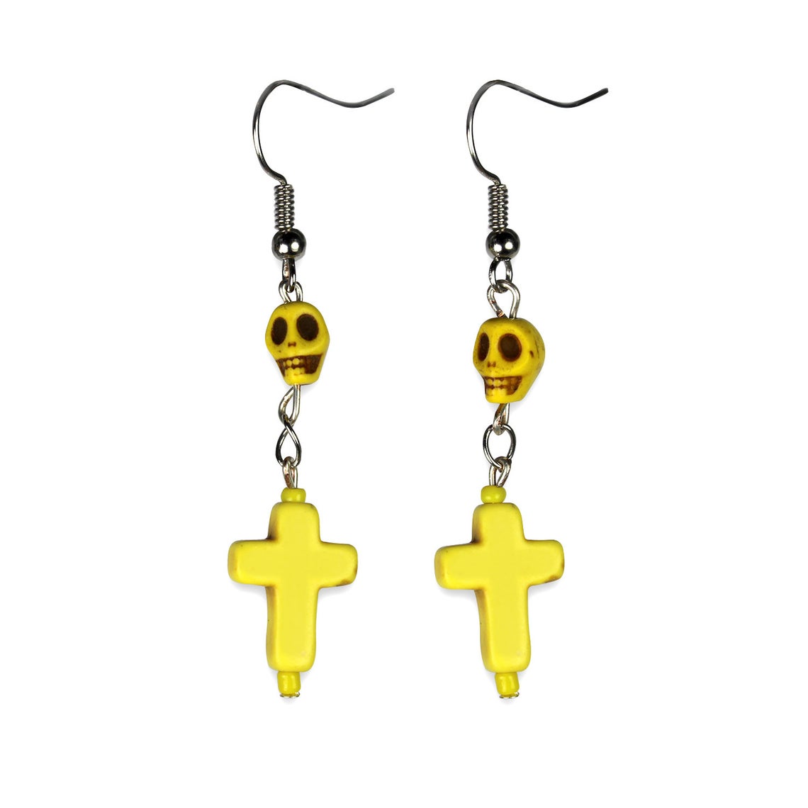 Dia De Los Muertos Skull and Cross Earrings, Howlite Gem Stone Womens Skull Earrings in Yellow