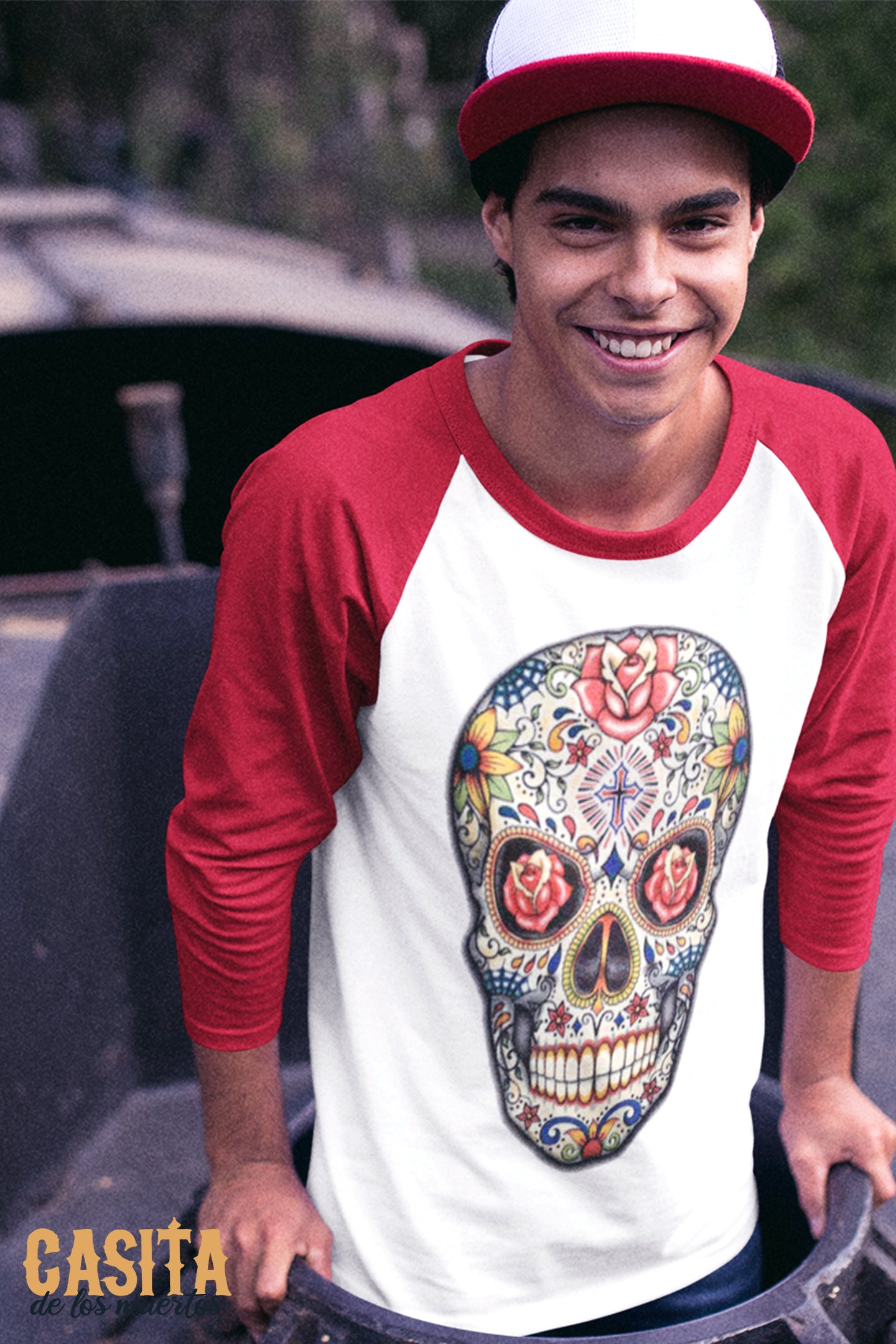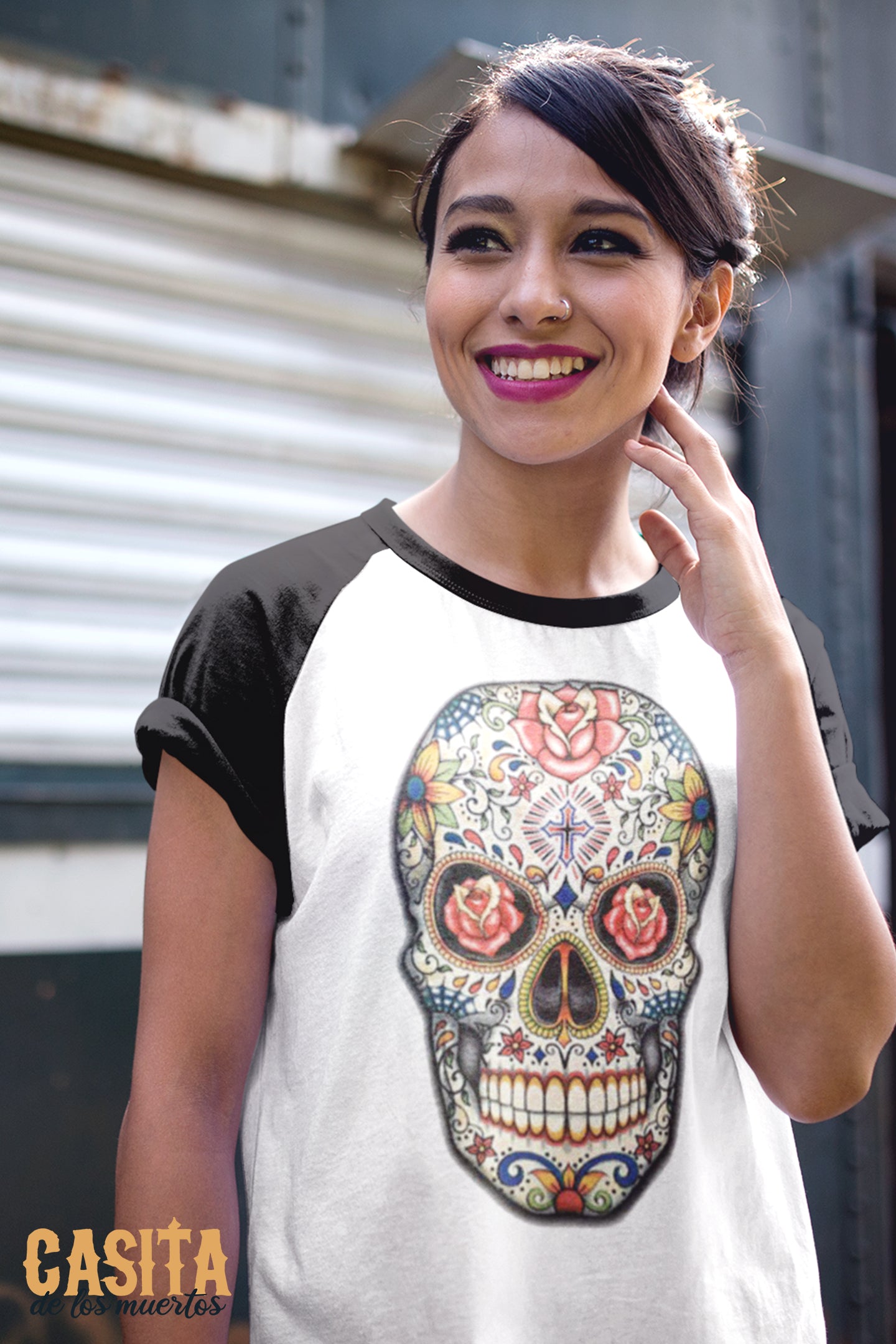Dia De Los Muertos Skull Candy Raglan Tee with Colorful Skull by Casita De Los Muertos