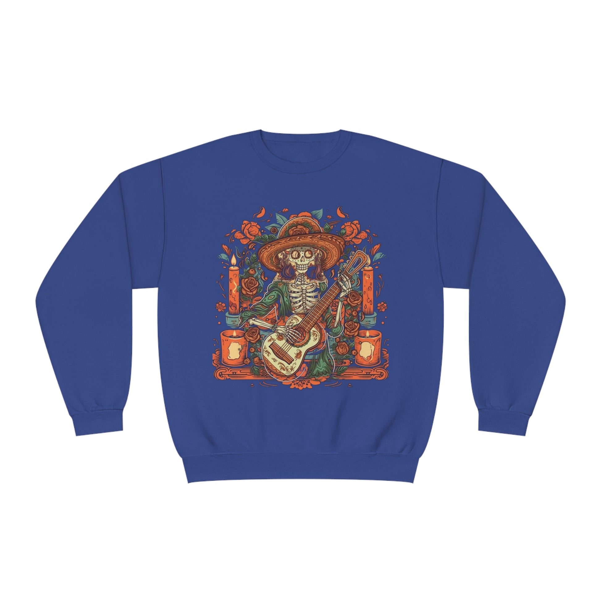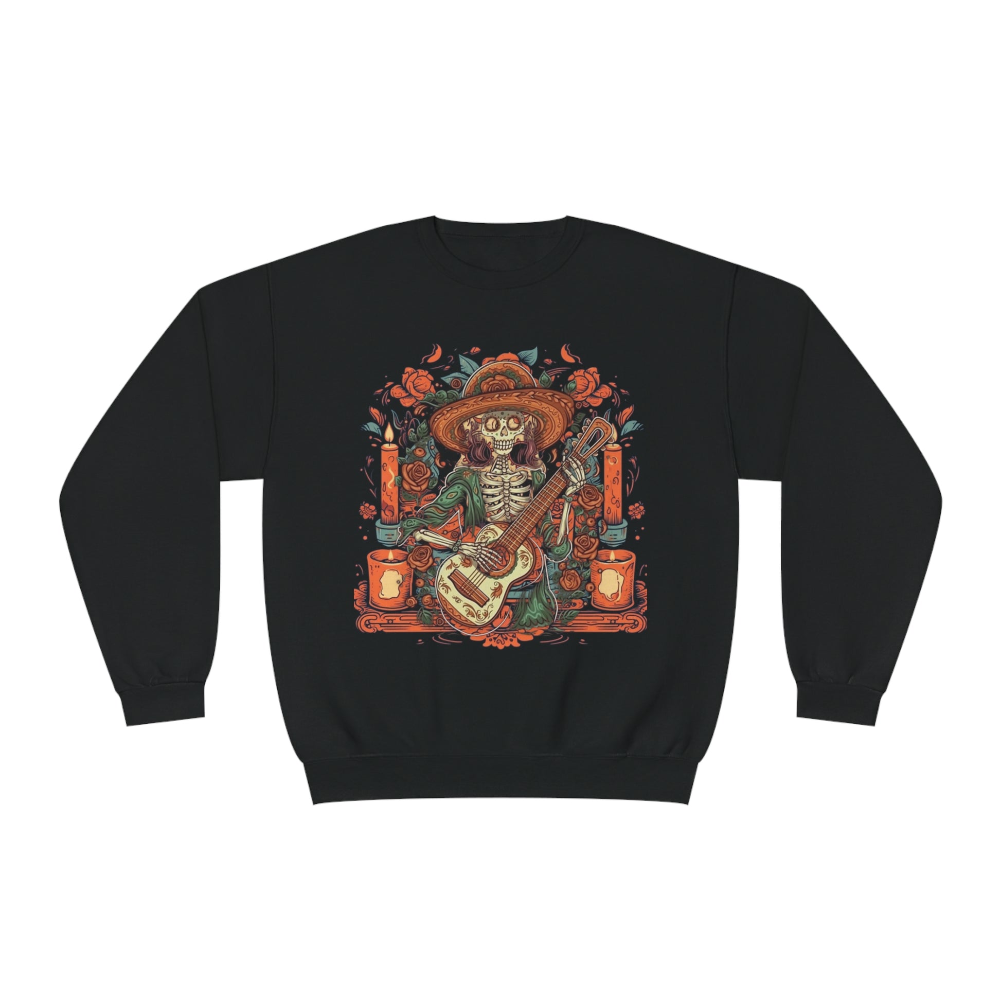 Lady of Music Day of the Dead Colorful Guitar Skeleton Unisex Pullover Sweater by Casita De Los Muertos