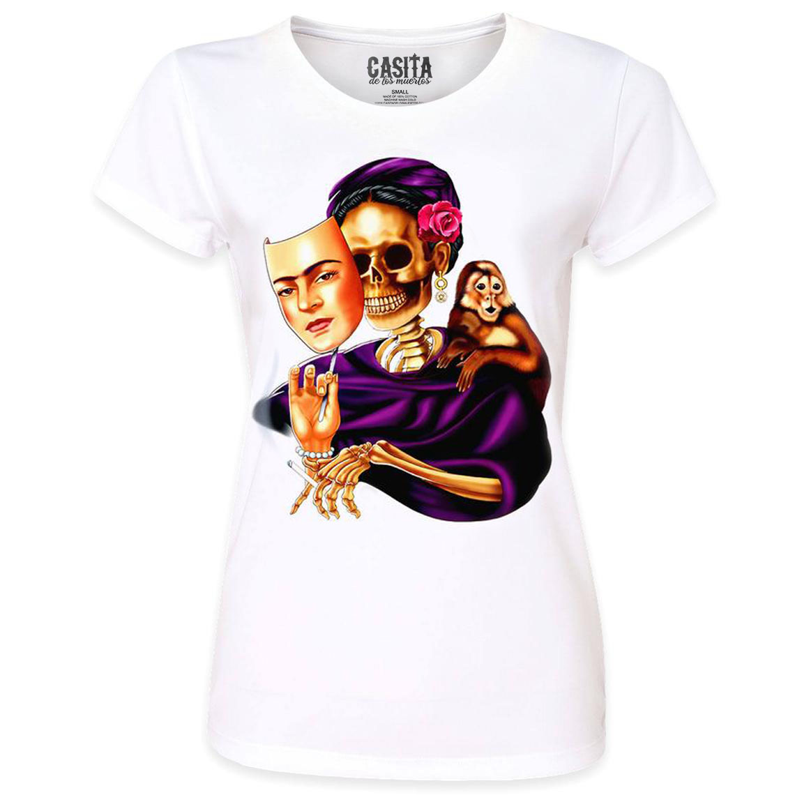 Celebrate the spirit of Frida Kahlo with the Women’s Frida Skeleton Self Portrait with Monkey T-Shirt by Casita De Los Muertos. This striking black tee features a vibrant, artistic rendition of Kahlo’s iconic self-portrait, reimagined with a skeleton twist and accompanied by a playful monkey. Crafted from soft, breathable fabric, it offers both comfort and style, making it a standout piece for art enthusiasts and fashion lovers alike. Embrace your unique flair with this bold, eye-catching design that pays homage to one of history’s most celebrated artists.